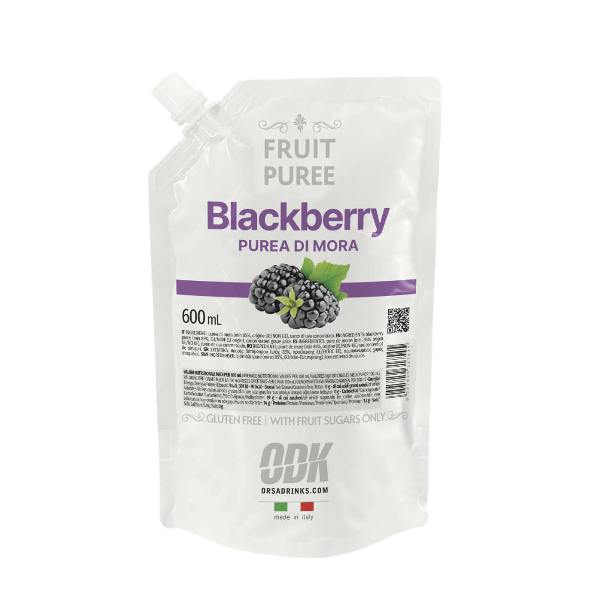 ODK Blackberry Fruit Puree is made with fresh blackberries of the highest quality, expertly sweetened with only sugars from fruit, in order to impart a boost of sweeteness to enhance the natural flavor profile of blackberries. The result is a thick, creamy puree with a distinctive deep purple color, rich in flavor.